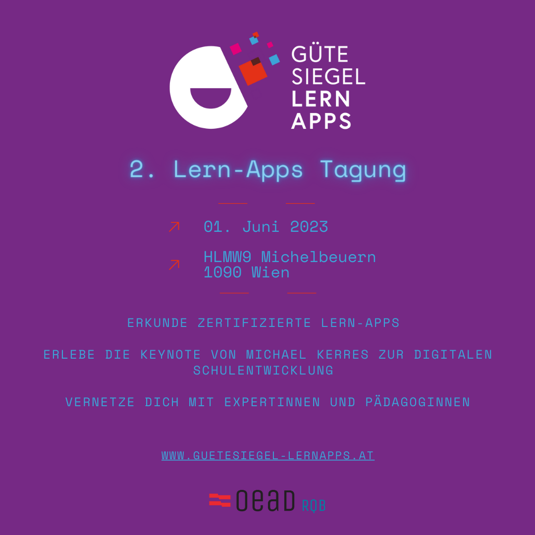 Am Donnerstag, den 01.06.2023 von 13-17:00 findet heuer die 2. Lern-Apps Tagung mit anschließender Gütesiegel-Verleihung statt. Tagungsort ist die HLMW Michelbeuern in Wien.