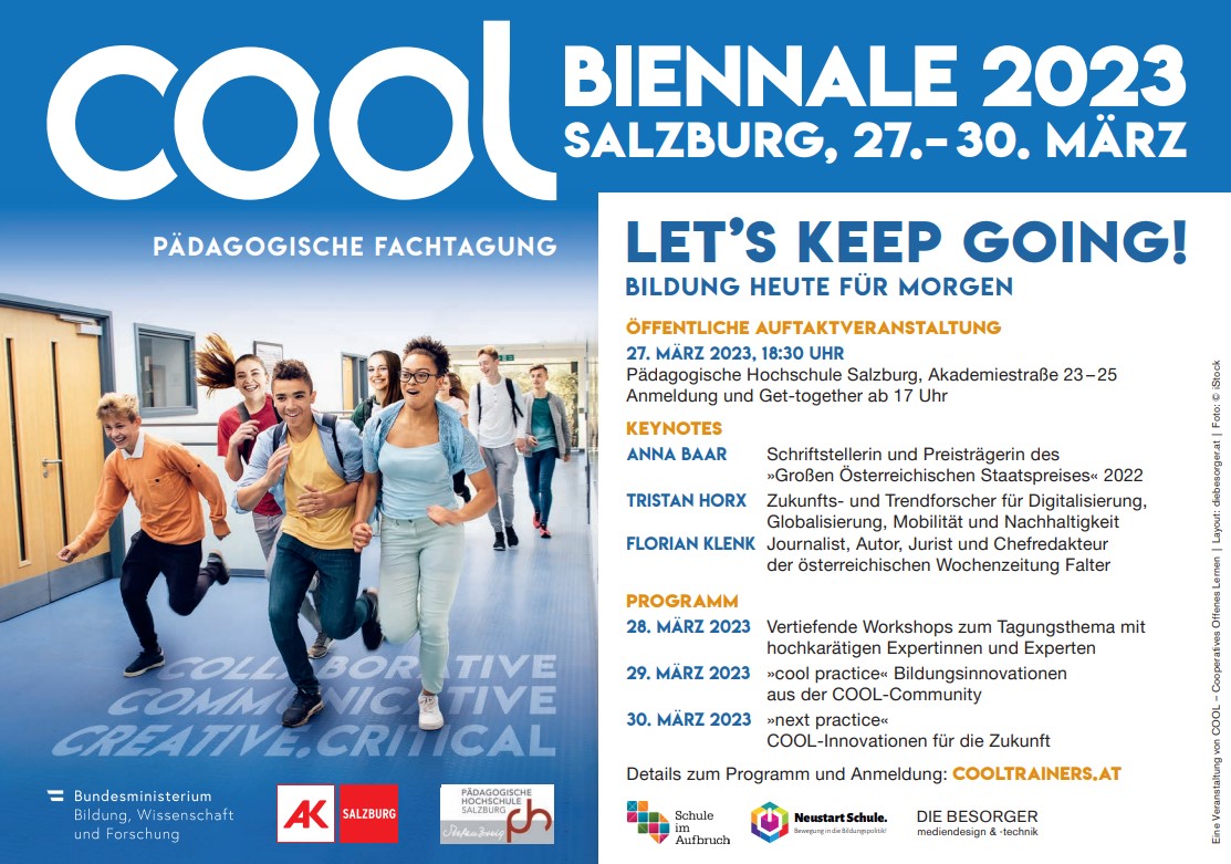 Die COOL Biennale ist DIE pädagogische Fachtagung der COOL-Community und findet 2023 vom 27. bis zum 30. März in Salzburg statt.